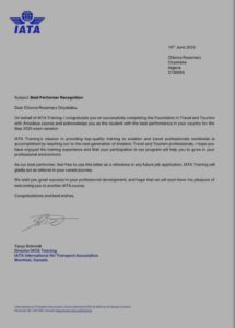Today, Chioma Rosemary Onyekaba stands tall as Nigeria’s Best Performing Student in IATA Training an award given by the International Air Transport Association (IATA), the world’s foremost authority on global aviation.