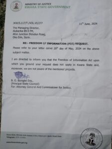 A call was made to this reporter on June 11, 2024, to come and receive the response to the FOI letter which she swiftly visited their office for. Contrary to expectations, the Kwara State Ministry of Justice failed to demonstrate the accountability that they were expected to embody. The response states that the FOI law does not apply in Kwara and is ignorant of the mentioned projects opposing the information on UDEME.