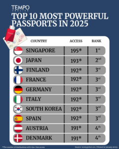 Singaporean passport holders now enjoy visa-free or visa-on-arrival access to 195 destinations – the highest recorded number in the index’s 20-year history. Japan follows closely with access to 193 countries, maintaining its stronghold as a travel-friendly nation.