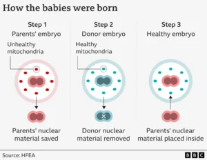 The technique involves transferring the nuclear DNA from the mother’s egg into a donor egg that has had its own nuclear DNA removed but retains the healthy mitochondria. The fertilized egg then contains genetic material from all three individuals — two women and one man — and is implanted into the mother.